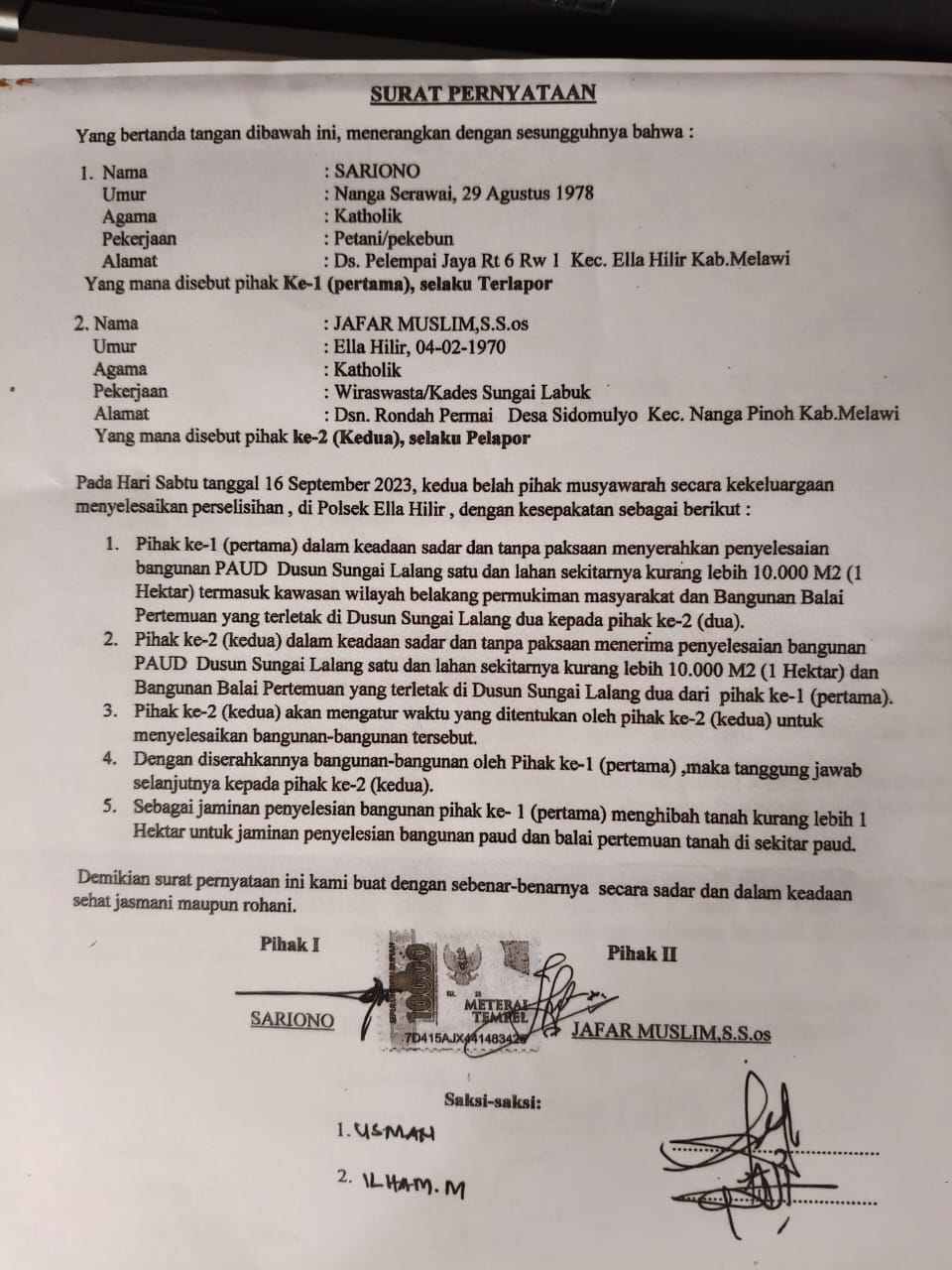 “Kalau mantan Kades Sariono mengklaim lahan ini masih sengketa, itu salah besar. Kami sudah melakukan mediasi resmi di Polsek Ella Hilir pada 16 September 2023, dan sudah ada saksi dari pihak kepolisian,” tegas Ja’far Muslim.